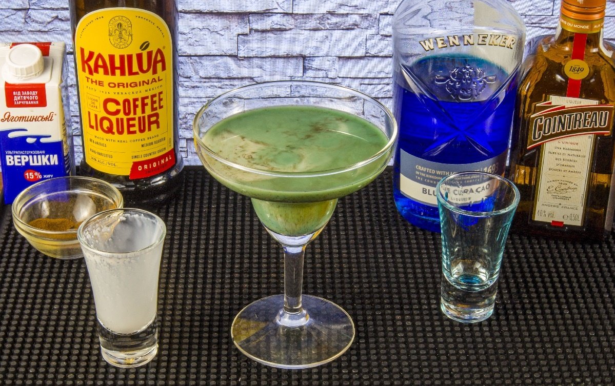7. Медленно начать пить содержимое бокала через трубочку. В это же время другой человек должен постепенно подливать «Блю Кюрасао» и сливки из рюмок в бокал.